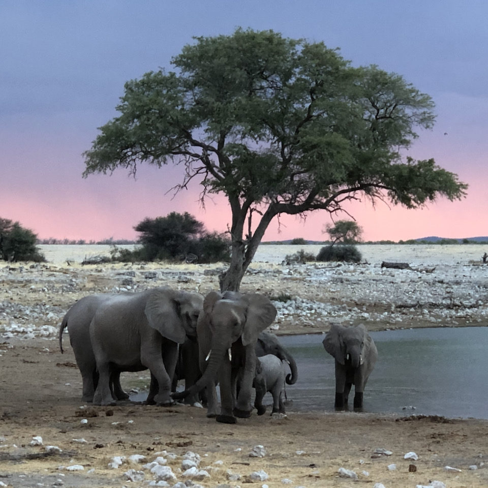 Der Etosha-Nationalpark liegt im Norden Namibias und zählt zu den bedeutendsten Wildreservaten Afrikas. In Namibia ist er mit Abstand der wichtigste und bekannteste Nationalpark und mit einer Fläche von rund 22.000 km² etwas größer als Hessen. Es wimmelt geradezu von Tieren. Nicht weniger als 110 Säugetier- und 340 Vogelarten leben hier! Darunter vier der berühmten „Big Five“: Löwe, Leopard, Elefant und Nashorn sind im Etosha-Nationalpark in Namibia heimisch – nur dem Büffel ist es hier zu trocken.